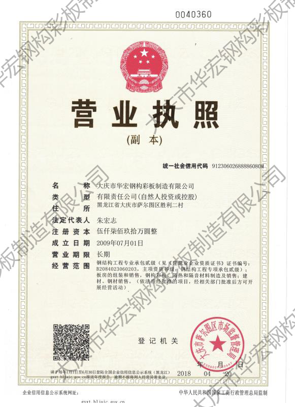 華宏鋼構始建于2009年8月9日,總部位于大慶市薩爾圖區(qū)南一路13號,現(xiàn)有大慶市華宏鋼構彩板制造有限公司、黑龍江省華宏力安綠建科技有限公司、大慶市華宏鋼構彩板制造有限公司長春分公司、黑龍江省海森新材料科技有限公司、大慶市瑞和通螺栓廠五家工業(yè)企業(yè)形成了以彩板復合板、裝配式鋼結構建筑、保溫材料、配件制造為主的五大生產(chǎn)基地,占地總面積 20余萬平方米,生產(chǎn)車間5萬平方米。中高層管理干部26 人,高級工程師9人,各類國家注冊執(zhí)業(yè)人員 32 人,車間技工 260人,專業(yè)安裝隊伍 10 余支,帶動就業(yè) 500